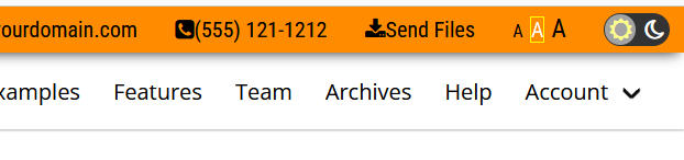 The screen shot above, by the way, is a portion of a new fixed InfoBar. I place it above the navbar. The left area has social media buttons and links, the right area has email address and contact phone number, both with icons. That's followed to the right by a file upload option, then the font-size switcher and the Dark/Light mode toggle switch.