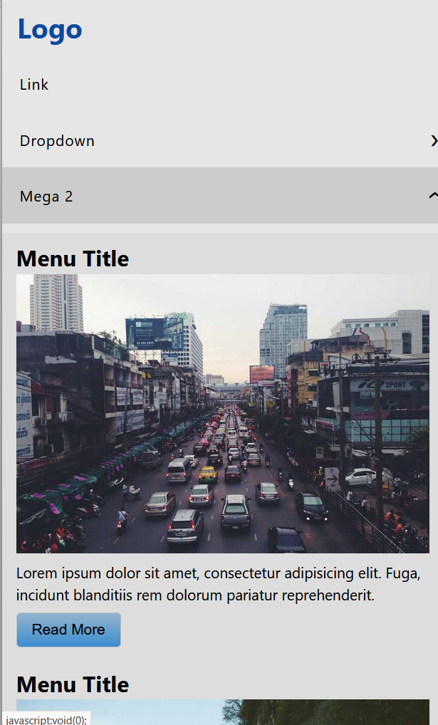 Responsive menu at the left. This has been a challenge. I ended up "breaking" my development project at least five times and starting over again. The biggest challenge is having both a multi-level dropdown and a megamenu dropdown on the same navbar.