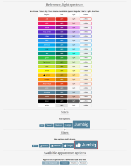 Go ahead, take a look at the results. Top right is my buttons.css file with 21 different colors, four appearances, five sizes, and four options. At the left is the Bulma colors added (bringing the total to 30 colors) and all the extras I have in my buttons.css file. Click to see a larger size.
