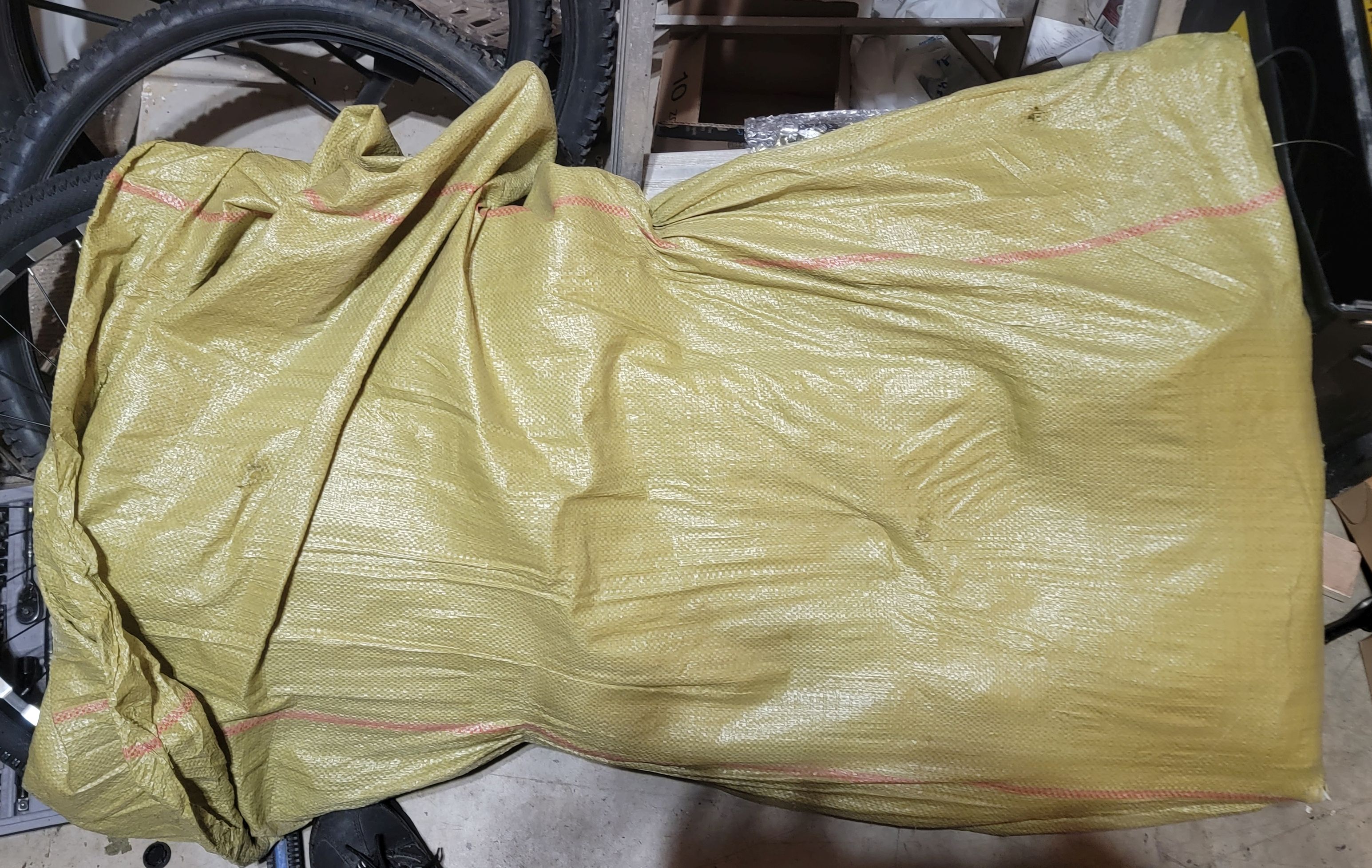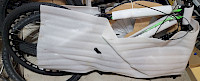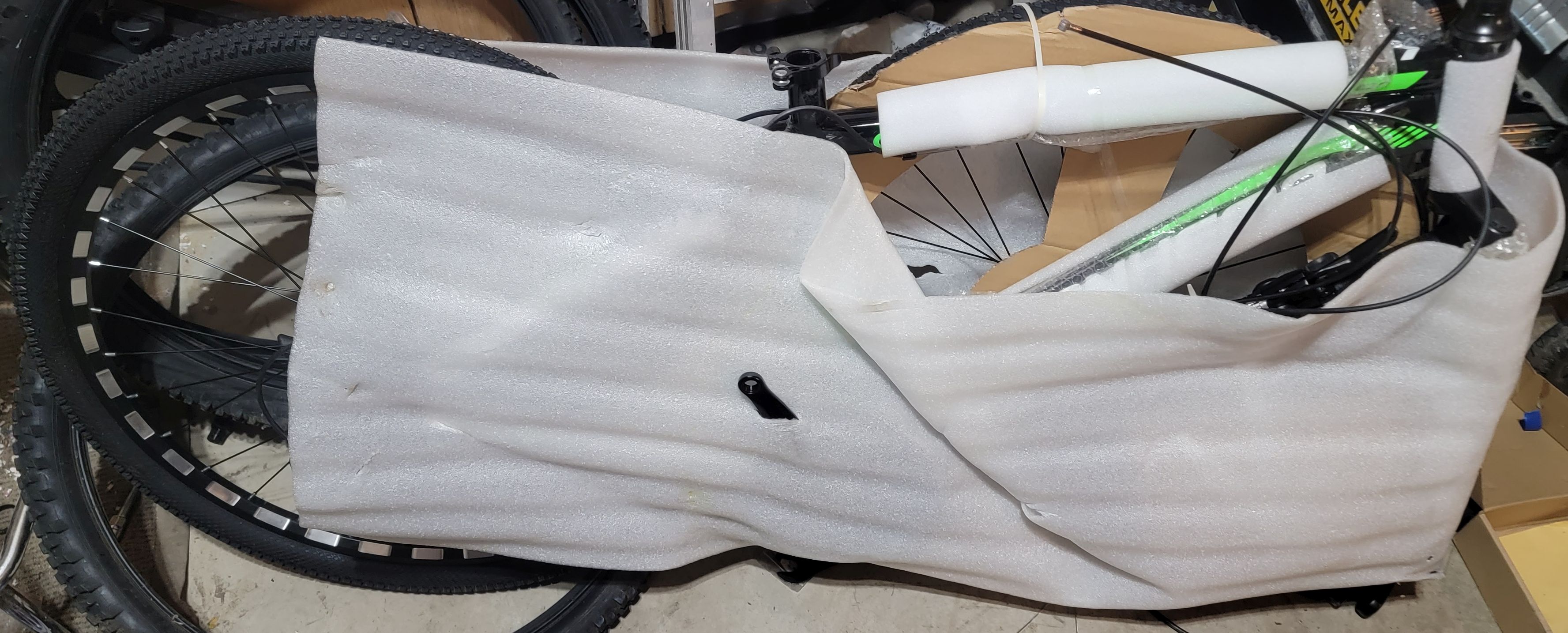 At the left is the same bike after taking off the transport "bag". You can see the bubble wrap and foam padding protecting the bike. There is a small spot where the paint is rubbed off from transporting – but it's a little nit.