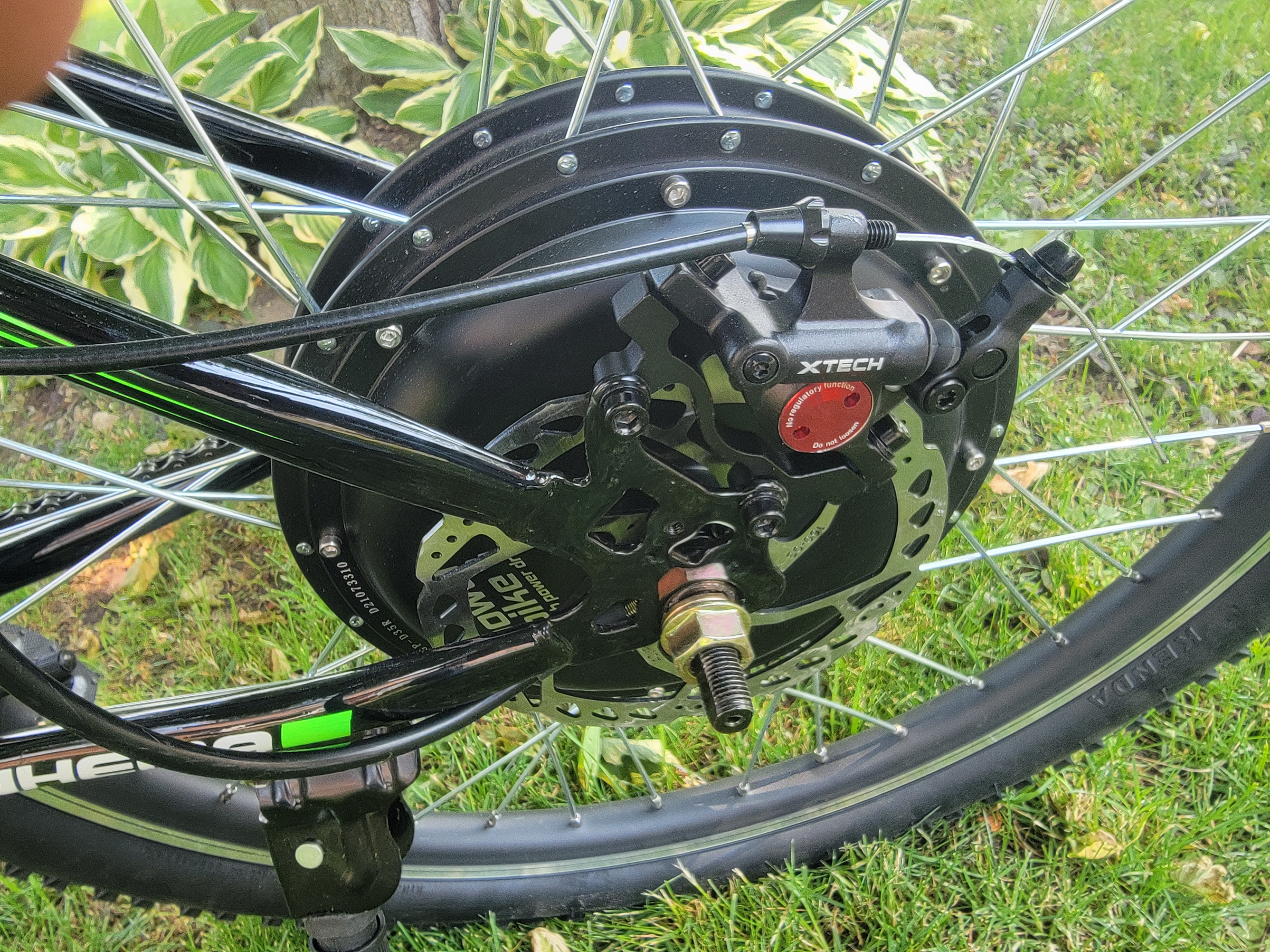 The bike I am using is brand new. Despite this, I removed the brake calipers and upgraded to new "wire-pull" hydraulic brakes. The first two pictures at the right are pictures of those new hydraulic brakes installed and fully functional. The first one is the front brake. The second is the rear brake (also shows the electric motor installed).
